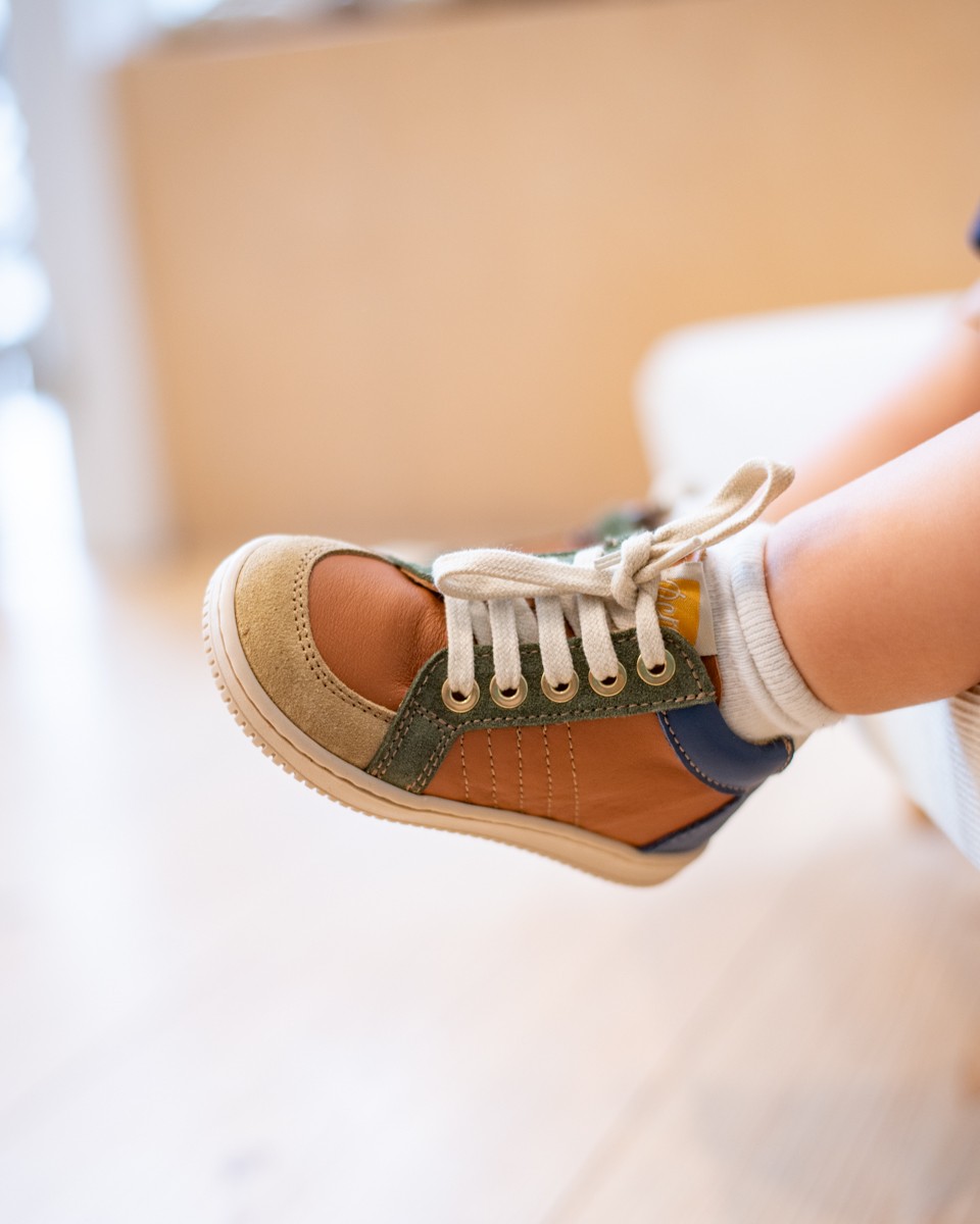 Baskets à lacets en cuir de veau avec détails en daim multicolore et fermeture éclair latérale pratique. Idéales pour les premiers pas, elles offrent maintien et stabilité grâce à leur conception conçue pour accompagner les tout-petits dans leurs premières aventures. Doublées en cuir de veau souple, elles sont dotées d'une semelle intérieure amovible recouverte de cuir et d'une semelle en caoutchouc souple et résistante.