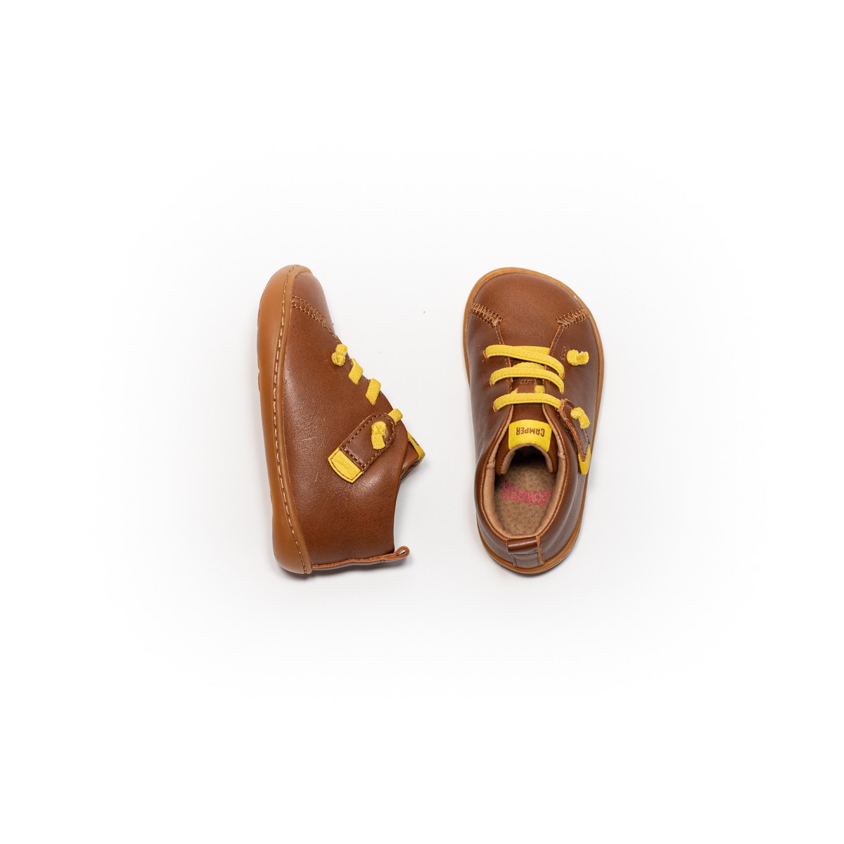 Bottines pour enfant en cuir de vachette marron avec semelle intérieure amovible en EVA, lacets élastiques, système auto-agrippant et semelle extérieure en caoutchouc (20 % recyclé). La gamme First Walkers comprend des modèles à la fois flexibles et robustes, conçus pour les tout-petits qui font leurs premiers pas. Découvrez notre collection de chaussures confortables pour les enfants en bas âge, conçues pour soutenir ceux qui sont prêts à se lancer. Une icône Camper qui évolue à chaque saison. Inspirée de la marche pieds nus, la Peu allie simplicité et fonctionnalité. Elle affiche des coutures à 360 degrés et une confection selon la technique Strobel, qui garantit une souplesse et une durabilité inégalées, quelles que soient les conditions.