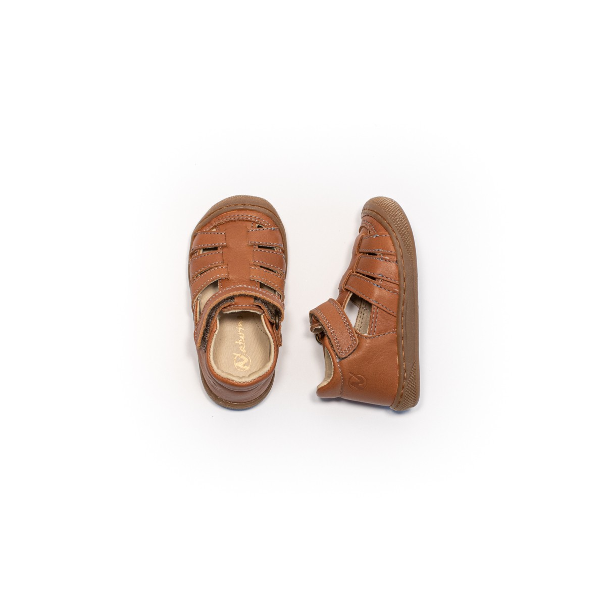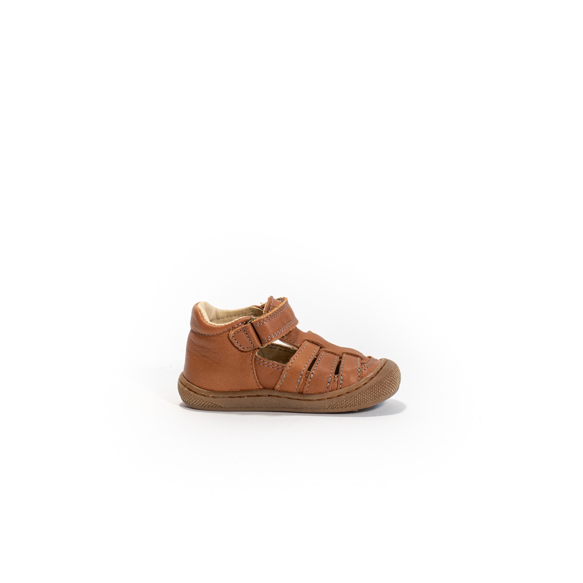 Sandale semi fermée premiers pas, talon structuré et col matelassé. La tige est en cuir nappa brossé, avec un scratch à la cheville. Doublure et semelle intérieure en cuir, semelle en caoutchouc avec bout renforcé.