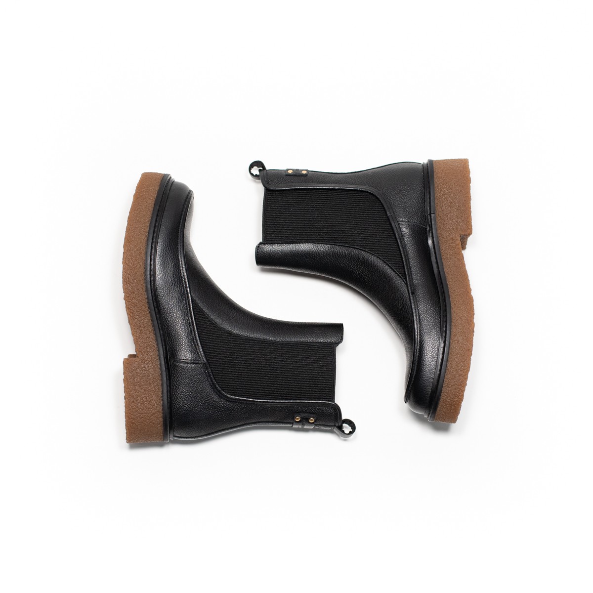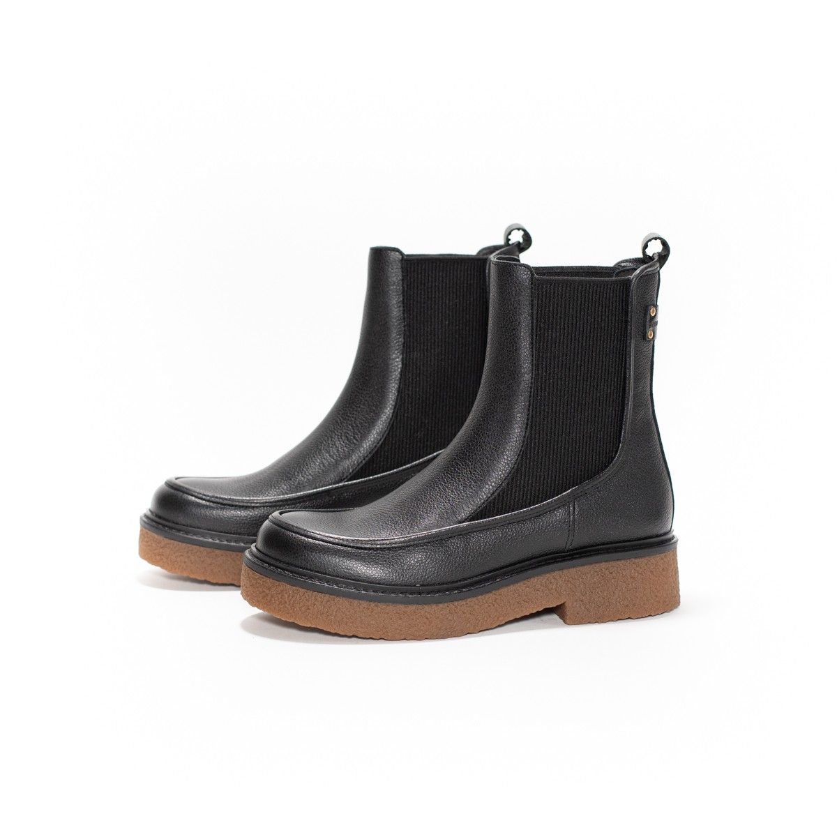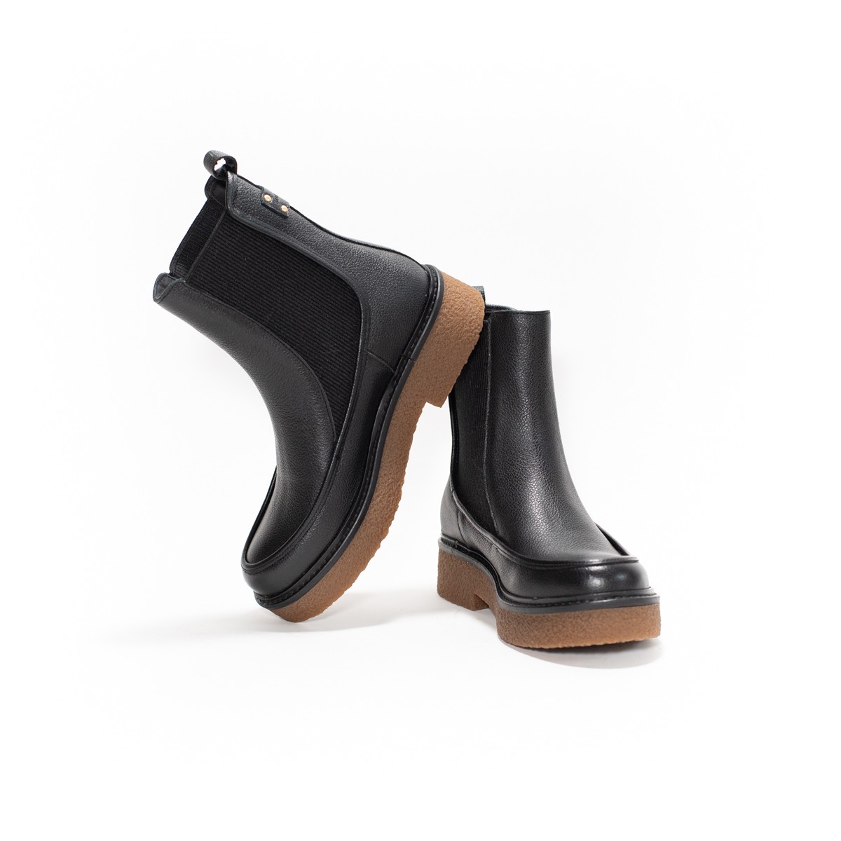 La bottine Cassie se distingue par sa semelle crêpe épaisse et son design épuré. Facile à enfiler grâce à ses larges élastiques côtés, elle assure un confort au quotidien tout en apportant une touche moderne à vos tenues.