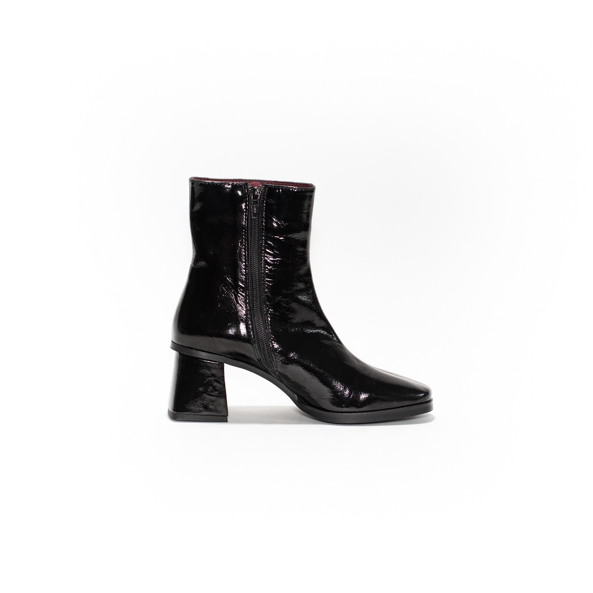 La boots Celie en vernis noir est canon avec son bout carré et son talon vintage. Elle fera votre tenue!
