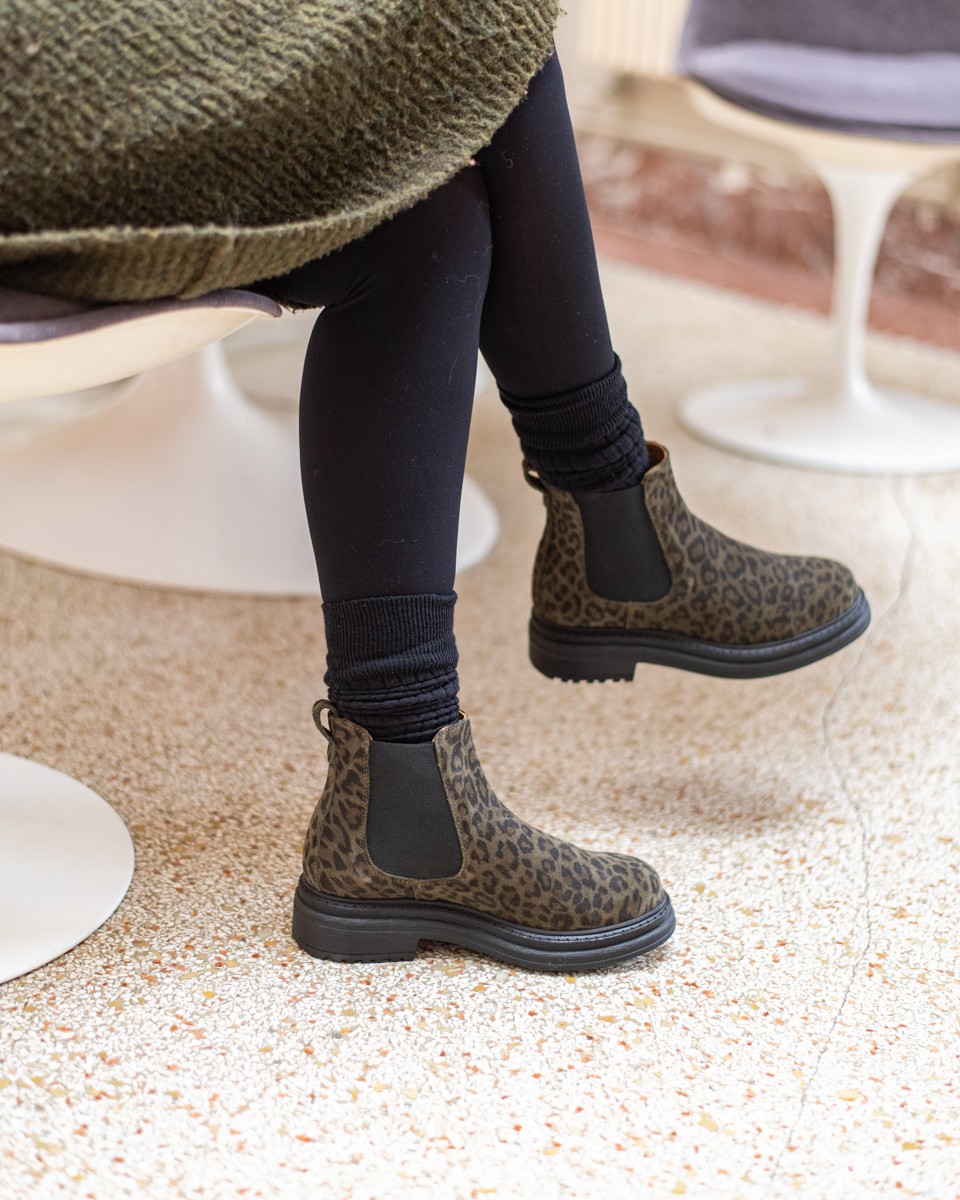 La Chelsea Boots en nubuck kaki à imprimer léopard est un classique indémodable.