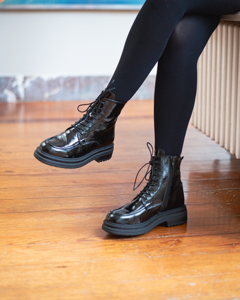 La Boots à lacets Moggie de chez Aliwell est un intemporel. Le vernis noir la rend élégante et rock à la fois.