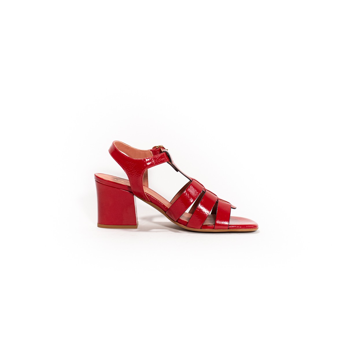 Sandales avec un talon stable. Nous avons choisi le cuir vernis. En exclusivité chez Victoire Chaussures!