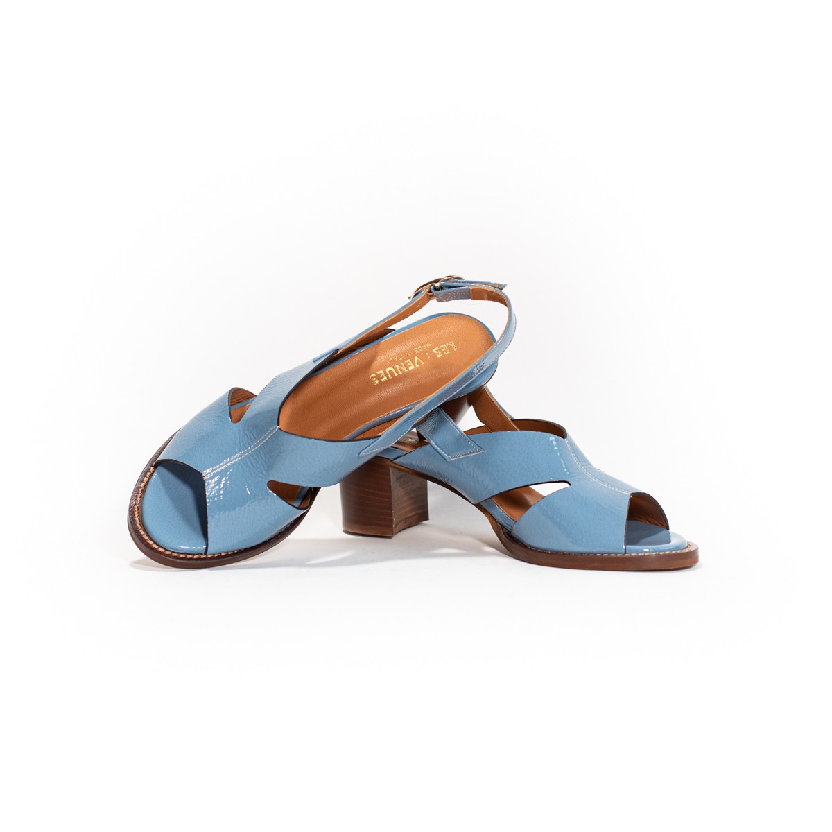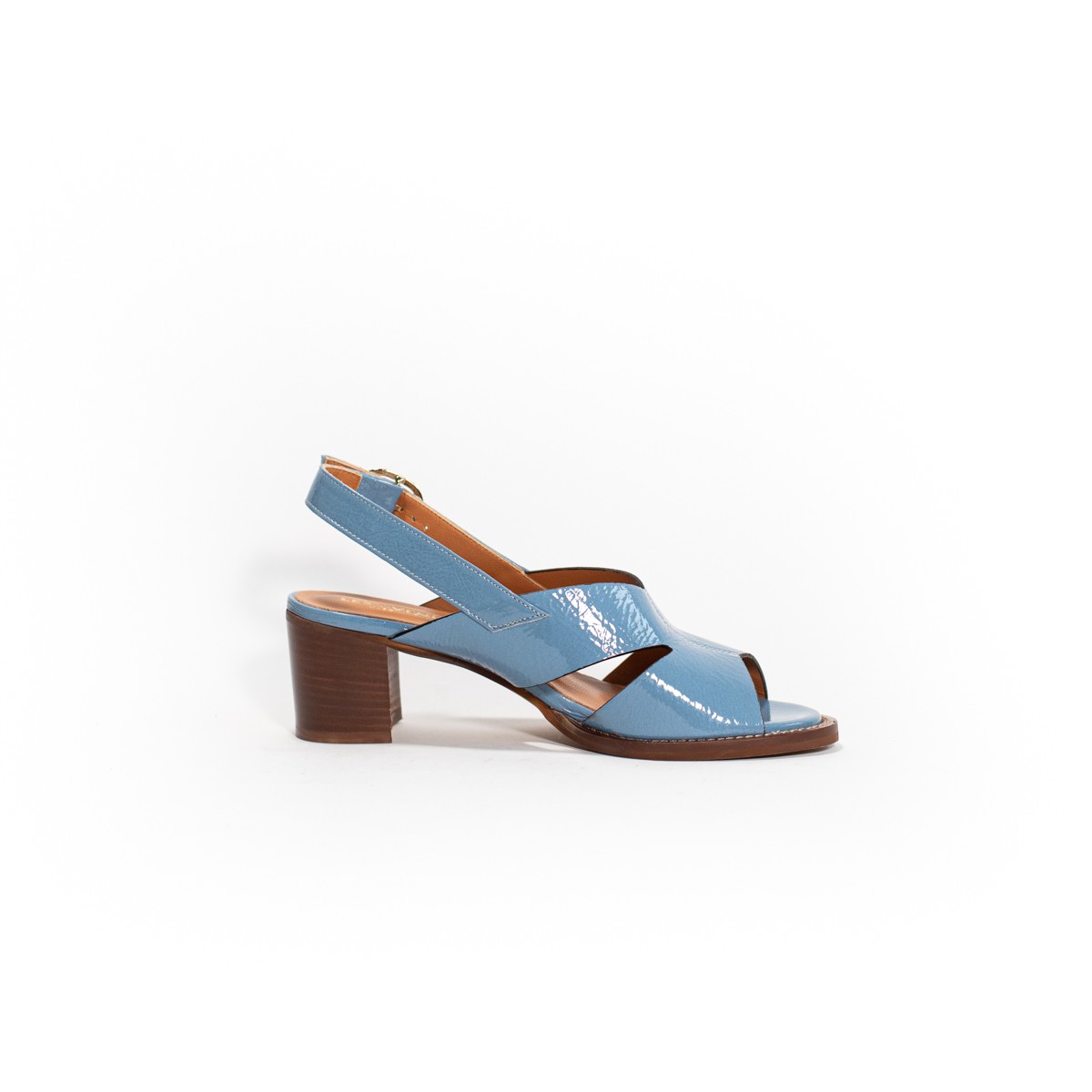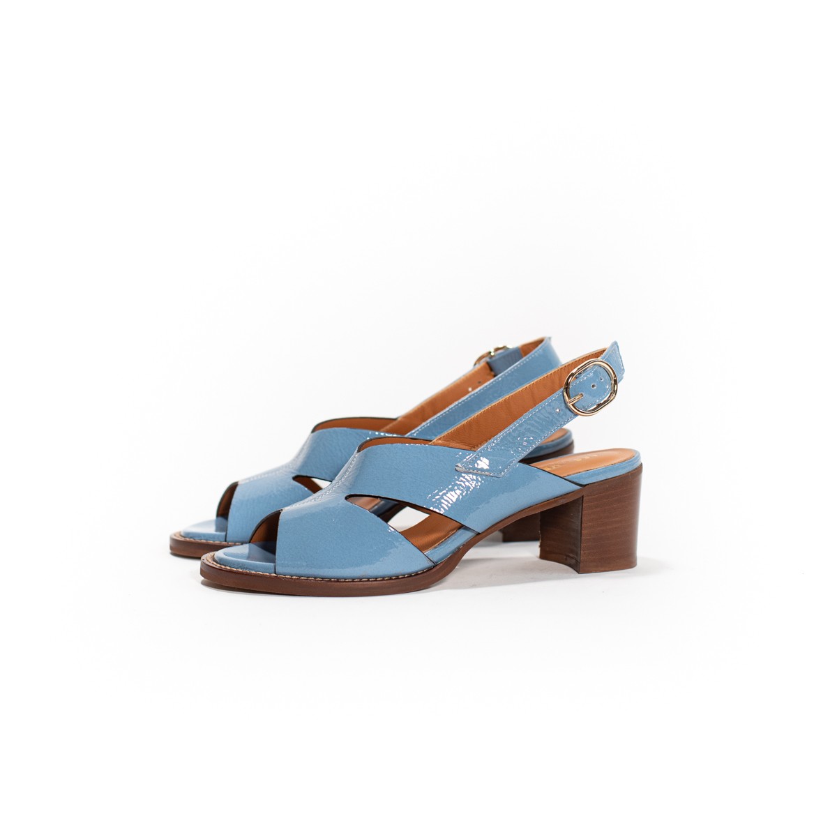 Sandales avec un talon stable. Nous avons choisi le cuir vernis. En exclusivité chez Victoire Chaussures!